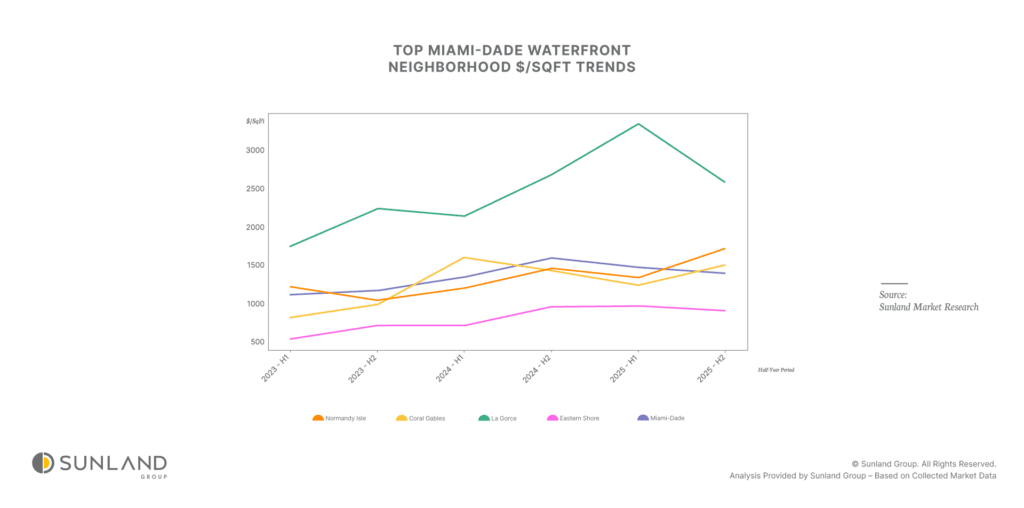 - Eastern Shores (North Miami Beach): 71% growth (24% CAGR), topping $969/sqft in 2025 H1.