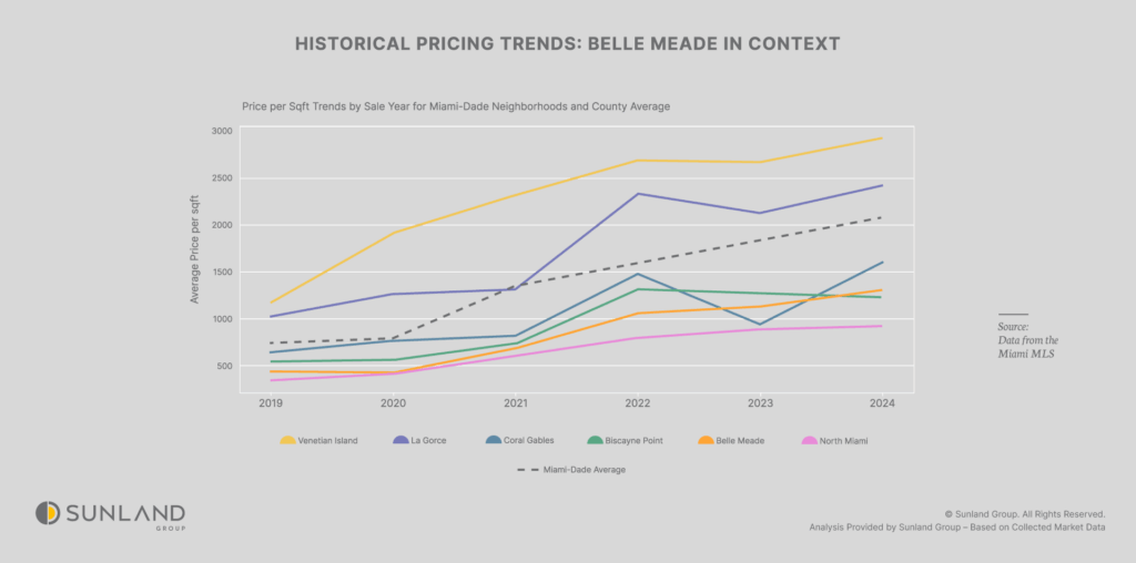 Compared to peers, Belle Meade’s pricing is competitive. Coral Gables and Venetian Islands command significantly higher averages $9.26 million (psf $1,607) and $29.13 million (psf $3,055) in 2024/2025, respectively, catering to ultra-wealthy buyers. Biscayne Point and North Miami align closer to Belle Meade, with 2024 averages of $5.11 million (psf $1,232) and $3.95 million (psf $918), though North Miami sees higher transaction volumes (up to 70). La Gorce, with $16.98 million (psf $2,422) in 2024, outpaces Belle Meade’s ceiling.